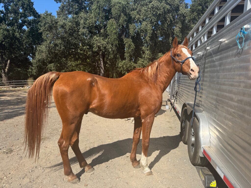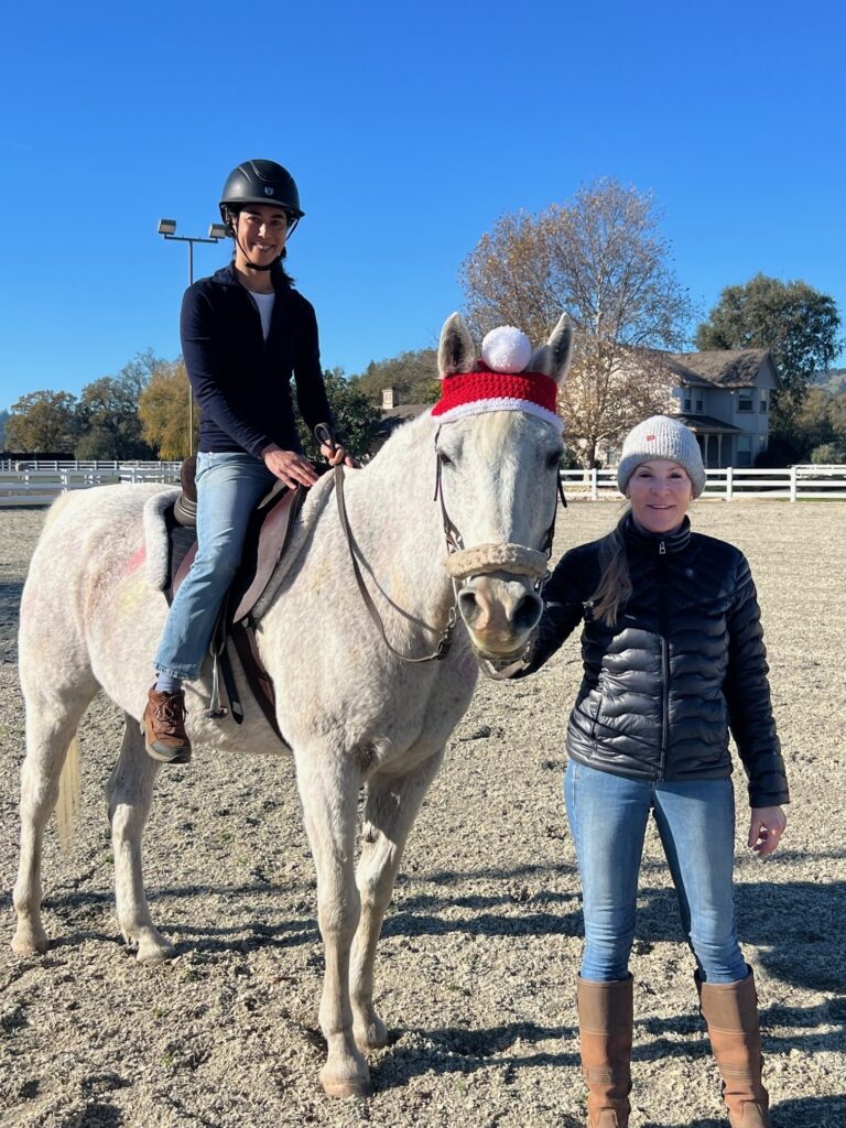 Fast forward to August 2025. Tiki was diagnosed with a heart murmur, something not uncommon in horses. Tiki’s lesson load was reduced as a result, and his health was monitored closely. By August 2026, the murmur had worsened, and so the veterinary staff at UC Davis advised Giant Steps to pull him from the program for liability reasons. Although we all understood the logic behind this decision, we also felt that Tiki was being forced into retirement when he wasn’t yet ready. Giant Steps threw a retirement party for him, and I brought him home to Tamber Bey in September. He will live out his life here, which, at the age of 23, could still be a long life. He has settled into his old home, has new friends, and enjoys interacting with visitors and trail riding around the vineyards.